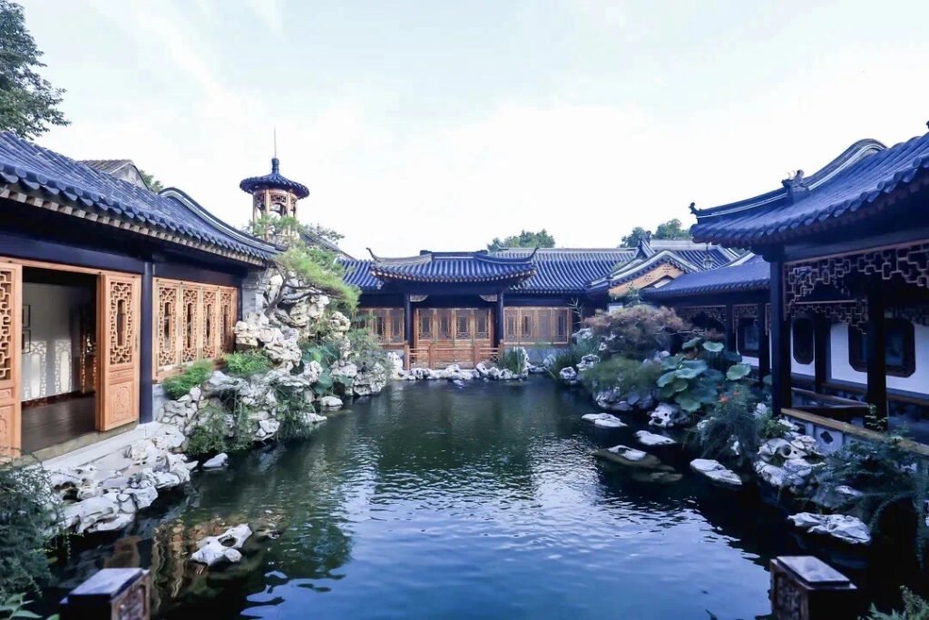 美术馆的水系部分浓缩了苏式园林的精华,筑山、理水、景窗、造林,亭台楼阁,布局紧凑。街柳庭花、晨钟暮鼓,一日四时,一年四季,各有殊异。