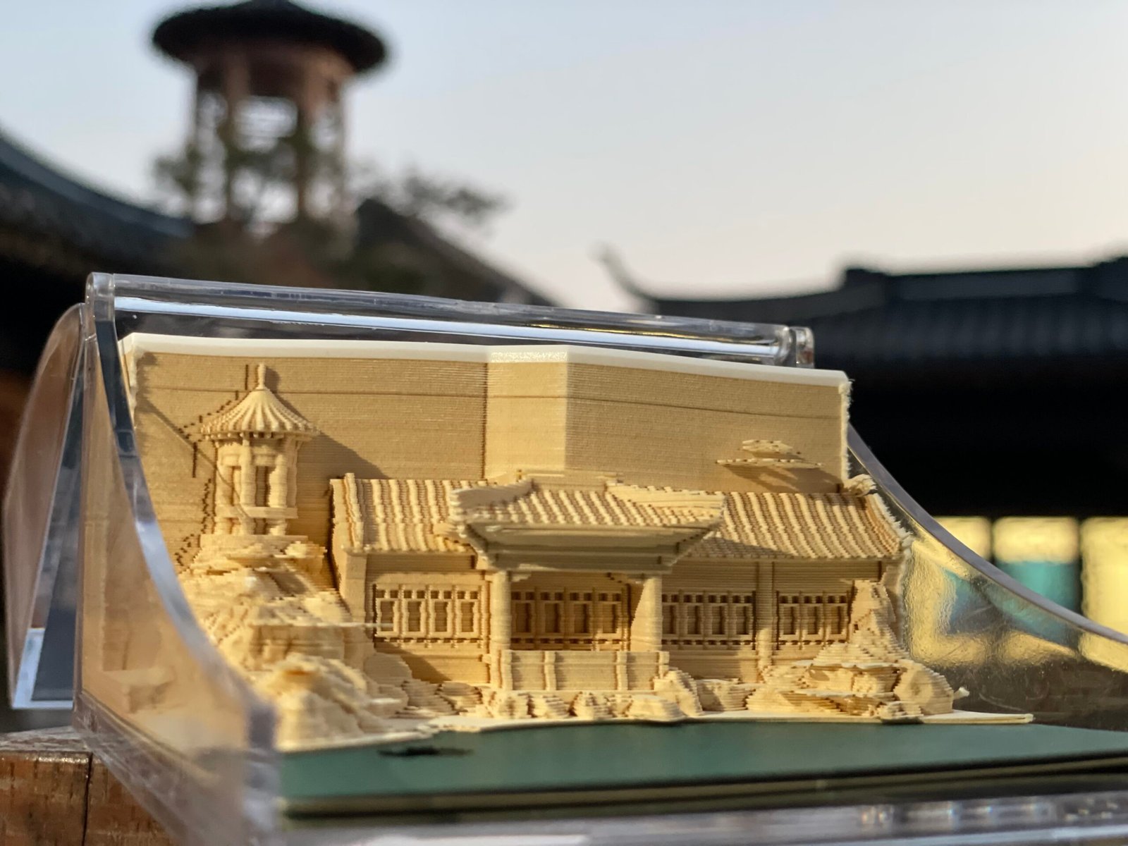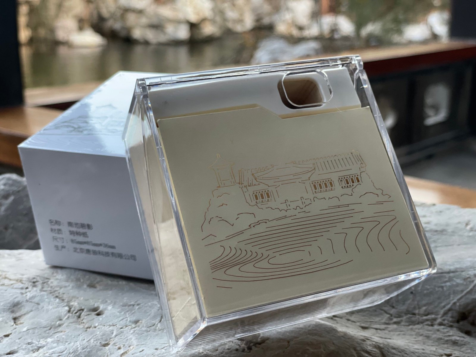 3D立体纸雕工艺还原南池园林的丰富层次,亭台,水榭,连廊,水边林下。每一张撕下的便签纸都有立体图案,同时,剩余的便签主体显露出南池的园林景观。飞檐翘角、月洞回廊,一款绝无仅有的纸上园林。